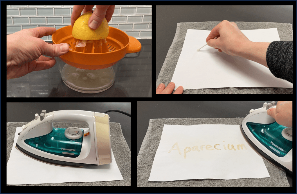 We’ll use lemon juice to write an invisible message and then we’ll use heat to drive the chemical reaction that will reveal it. Lemon juice dries colorless on paper when you write with it, so it can be used to leave an invisible message. Even though we can’t see them, there are many chemicals present in the lemon juice that are left on the paper. Some of those chemicals can go through a reaction called oxidation which causes them to turn brown. We can make that reaction happen faster by adding heat with the iron.