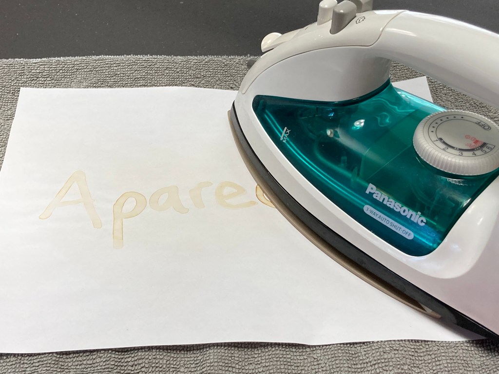 - Carefully (have a grown up help), set the iron on top of the invisible message. The heat from the iron will drive the chemical reaction and reveal your hidden message.