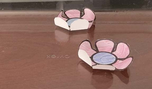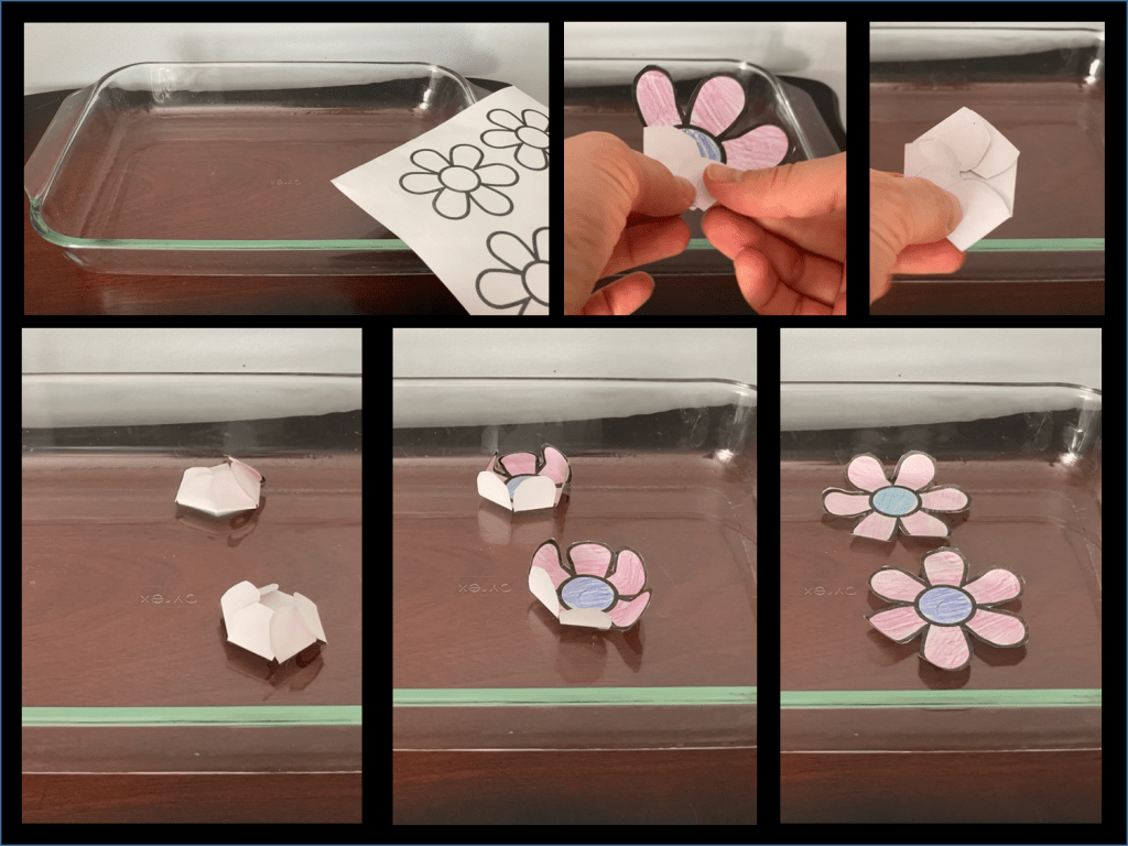 In our activity, we are going to make paper flowers bloom with water. We’ll fold our paper flowers and then place them in water. When the paper starts to absorb the water, the cellulose fibers in the paper start to expand. As the water soaks out to the folded petals (with capillary action), that expansion causes the paper to unfold and the flowers to bloom.