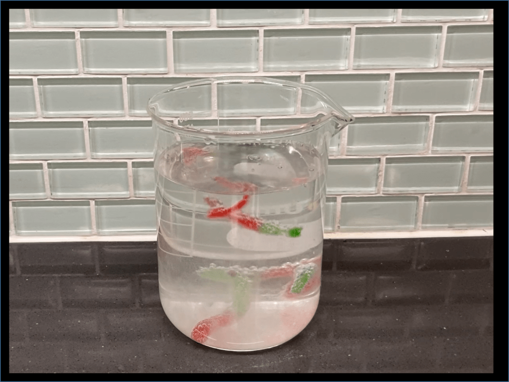 In our activity, we are going to use a chemical reaction to make gummy worms move or dance around. We’ll soak the gummy worms in a baking soda solution and then transfer them to a cup of vinegar. The baking soda that soaked into the gummy worms and the vinegar will react, forming carbon dioxide gas bubbles. The gummy worm will appear to dance around as the bubbles form, lifting parts of the worm up and dropping it back down when the bubbles come off of the worm.