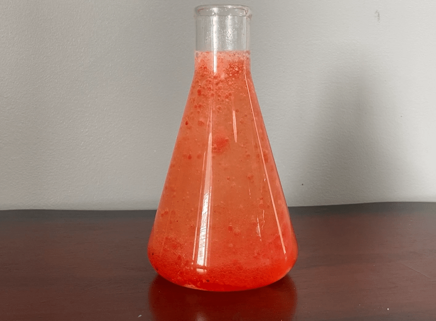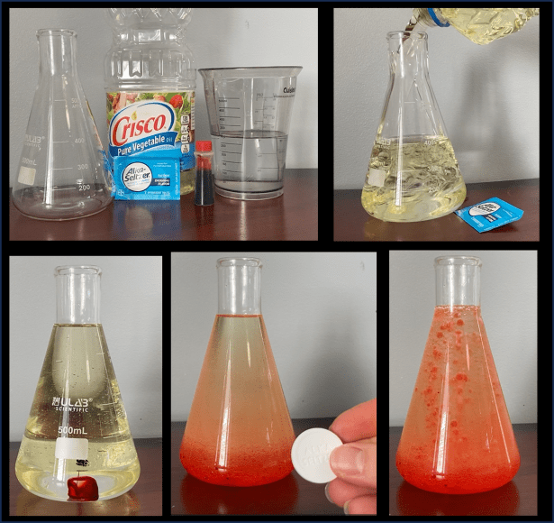 There are a few different things going on with this potion. First, we are seeing some solubility effects. Solubility is how things mix with each other (or don’t). The water and oil don’t mix with each other because they aren’t soluble. The food coloring is water based so it is only soluble with the water layer and only mixes into that layer. We are also seeing some density effects – the more dense layer is on the bottom and the less dense layer is on the top. Then, we are seeing the impacts of a chemical reaction that forms a gas. When we add the Alka-seltzer tablet, it starts to dissolve in the water and release bubbles. As the bubbles rise to the top of the jar (because they are less dense), they carry water with them. The water drops don’t mix in with the oil as they move through that layer because they still aren’t soluble with the oil. Eventually the bubbles reach the top and the water drops fall back to the bottom based on density.