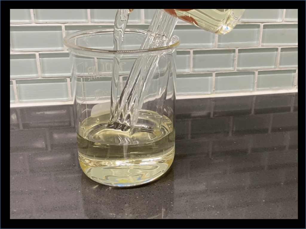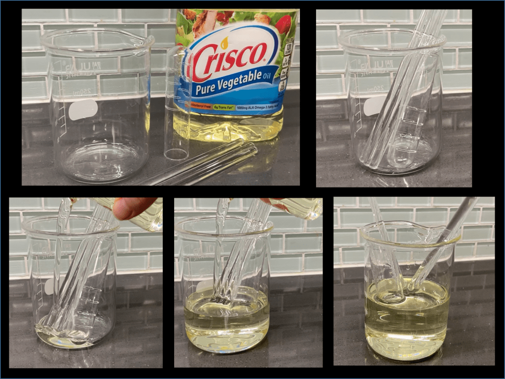 In our activity, we will vanish glass objects in a beaker of oil based on their similar refractive indices. Refractive index is a measure of how light moves through a material – one of the things it tells us is how a light beam bends when it enters the material. If the refractive index of two materials is similar, the light won’t bend very much when it moves between them. Part of how we see glass objects relates to how the light refracts or bends when it moves through the object, and also how the light reflects off of the object. Here, we are using materials – glass and oil – that have very similar refractive properties. If we surround the glass objects with the oil, the light won’t change when it moves from the oil to the glass and we aren’t able to see the objects the way we usually would – making them appear to vanish.